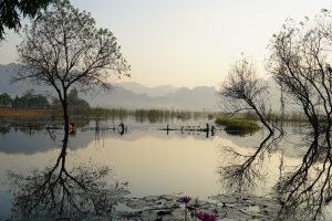Van Long Wetland Nature Reserve (“Vanlong Wetland”) in Ninh Binh, or the “Halong bay on land,” the habitat of critically endangered white pant langur and international station for migratory birds, features 4 distinct seasons—spring, summer, autumn, and winter — each with unique beauty and charm throughout the year. Featured by stunning limestone karsts rising from emerald wandering rivers, lush rice fields, friendly local peole and tranquil villages and of course, tasty authentic local cuisines. Lush rice fields and green in Spring, Summer of vibrant lotus blossoms; Autumn of dream pink and red water lilies, golden rice paddies and winter of migratory birds.