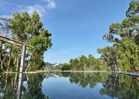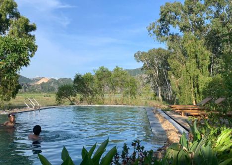 an infinity swimming pool using electrolyzed water (produced by the electrolysis of water containing dissolved sodium chloride) heathy for swimmers, looking over Vanlong Wetland Nature Reserve with Cafe nearby, where you can take a coffee, read a book or just simply lie down on your chair while enjoy the tranquility of Vanlong Wetland.