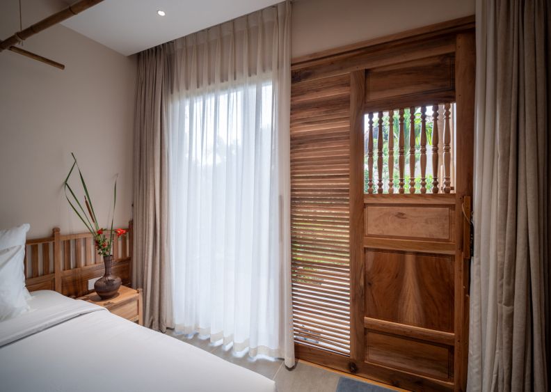 Consist of one Double bed for 2 adults or 2 adults and 1 kid under 6 years old. Equipped with natural wood furniture with traditional patterns, aircon, water heater, shower and bathtub, working desk.