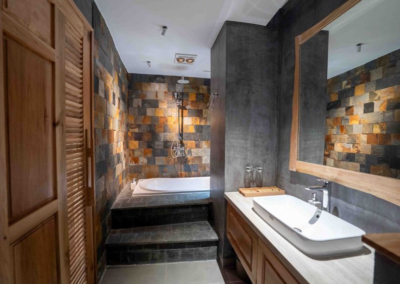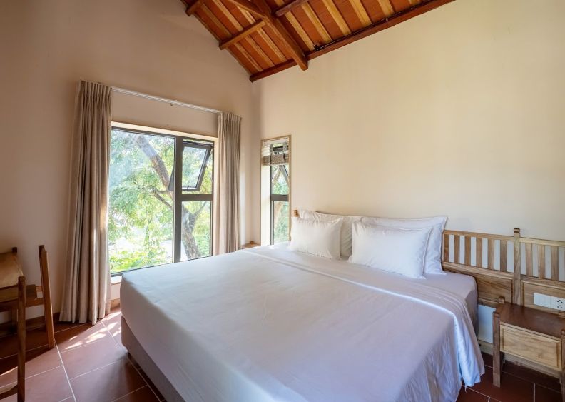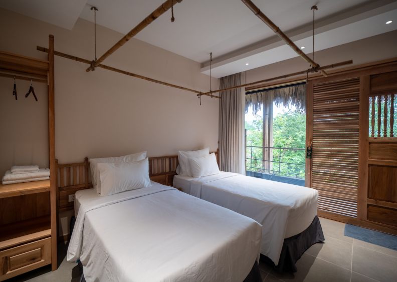 Consist of one Twin bed for 2 adults or 2 adults and 1 kid under 6 years old. Twin beds can be easily combined into one Double bed when required. Equipped with natural wood furniture with traditional patterns, aircon, water heater, shower and bathtub, working desk.